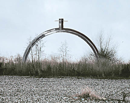 Auf der Höhe des Bogens befindet sich ein Kreuz in der Form, wie es, von oben gesehen, auch griechisches Kreuz genannt wird und wie es dem Querschnitt des Bogens entspricht. Es erscheint dieser Aufsatz auch von der Seite aus gesehen als Kreuz, aus welcher Richtung man auch auf den Bogen schaut, allerdings verfremdet, weil der horizontale Teil, der von oben gesehen eine Fläche ist, so schmal ist, wie das Stahlblech dick ist. Je näher man der Skulptur aber kommt, umso breiter werden die horizontalen Arme und die Form des lateinischen Kreuzes.